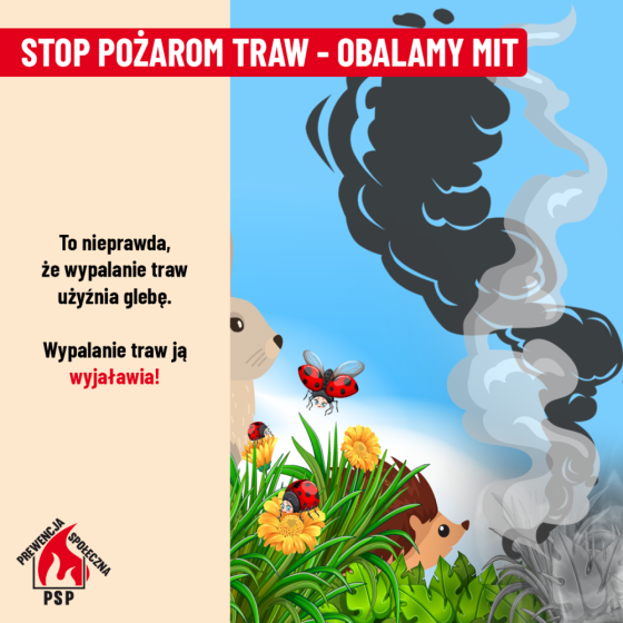 Kampania społeczna Państwowej Straży Pożarnej „Stop Pożarom Traw” rozpoczyna się od 1 marca. Już od wielu lat przełom zimy, wiosny oraz przedwiośnie to okresy, w których wyraźnie wzrasta liczba pożarów łąk i nieużytków. Wiele osób wypala trawy i nieużytki rolne, tłumacząc swoje postępowanie chęcią użyźniania gleby. Od pokoleń wśród wielu ludzi panuje bowiem przekonanie, że spalenie trawy spowoduje szybszy i bujniejszy jej odrost, a tym samym przyniesie korzyści ekonomiczne. Jest to jednak całkowicie błędne myślenie. Rzeczywistość wskazuje, że wypalanie traw prowadzi do nieodwracalnych, niekorzystnych zmian w środowisku naturalnym – ziemia wyjaławia się, zahamowany zostaje bardzo pożyteczny, naturalny rozkład resztek roślinnych oraz asymilacja azotu z powietrza. Do atmosfery przedostaje się szereg związków chemicznych będących truciznami zarówno dla ludzi jak i zwierząt. Wypalanie traw jest również przyczyną wielu pożarów, które niejednokrotnie prowadzą niestety także do wypadków śmiertelnych. Rocznie w tego rodzaju zdarzeniach śmierć ponosi kilkanaście osób.
